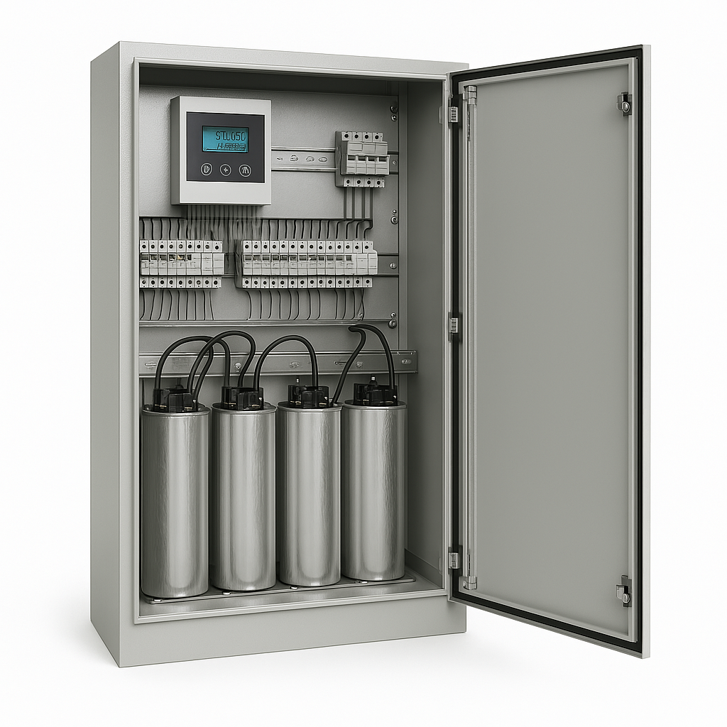 Ideal para sistemas com variação constante de carga, o banco de capacitores automático realiza a compensação de energia reativa de forma inteligente. Por meio de sensores de corrente e tensão, o controlador avalia, em tempo real, a necessidade de correção e aciona os módulos capacitivos conforme o fator de potência.